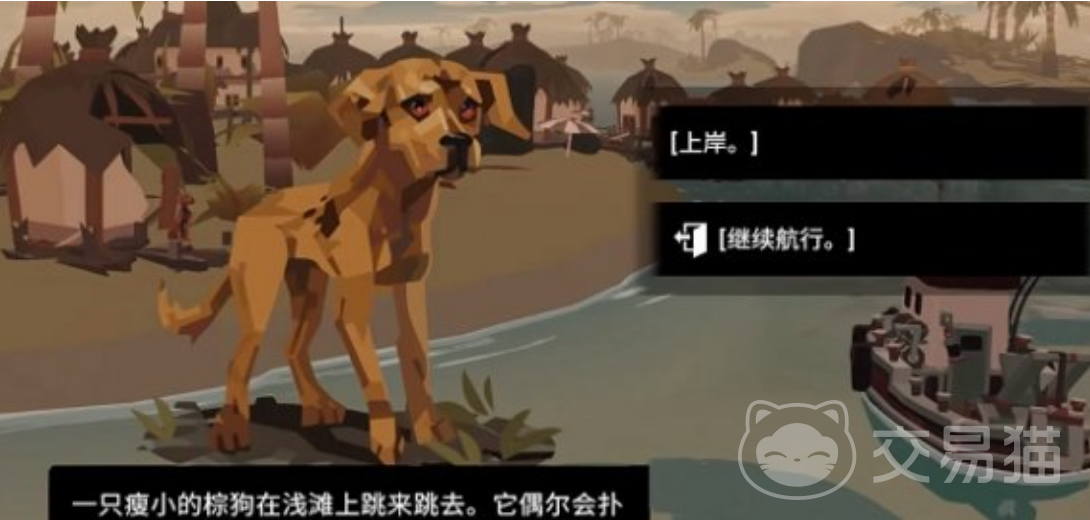 大家在做选择时不要选择继续航行,而是要选择上岸,这样我们基于可以走到浅滩处给小狗喂鱼肉,小狗在吃鱼肉过程中,我们要慢慢的接近它,抚摸它,这样我们才能把小狗给带到船上去。