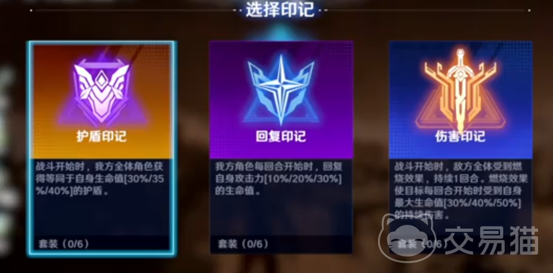 每次成功击败一个敌人后就可以选择不同的印记,如下图所示有护盾印记、回复印记和伤害印记,护盾印记可以在战斗开始的时候让我方所有角色获得一定的护盾值,回复印记能在战斗开始时回复一定生命值。