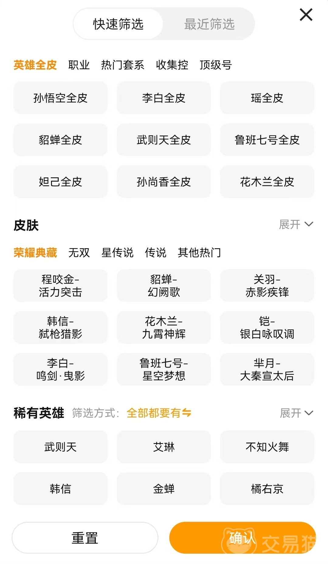 交易猫对于这款游戏的账号展现也非常清楚,因为号中最主要的就是拥有哪些极品皮肤和稀有英雄等,这些在账号中都会非常清楚的罗列出来。用户也可以通过筛选功能去进行非常细致的选择,例如通过筛选不同英雄皮肤,稀有英雄,输入典藏数量、传说数量等这样一番操作,就可以在众多账号中快速找到最符合自己要求的几个。接下来仔细查看一番,再结合一下价格就能很容易否定目标。