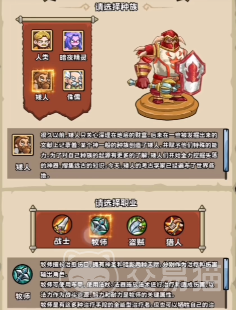 一开始咱们在进入游戏之后第一个需要选择的就是职业。游戏里面是有着种族之分,目前游戏之中咱们可以选择的种族总共是四个,它们分别是人类,暗夜精灵,矮人和侏儒。种族除了自己的外观上会和其他的有着区别外,每一个种族可以选择的职业也有所不同。咱们可以选择一个自己看的过眼的种族来作为自己的开荒角色。在选择好种族之后便需要选择职业。游戏里面的职业是5个,它们是战士,法师,牧师,盗贼和猎人。