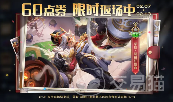 时间为2月7号更新后到2月13号,秒杀返场价格为60点卷,本次返场结束这款皮肤将不再以直售形式返场,在这个时间大家还会迎来英雄苍的折扣,原价18888金币,活动期间只要13888金币。
