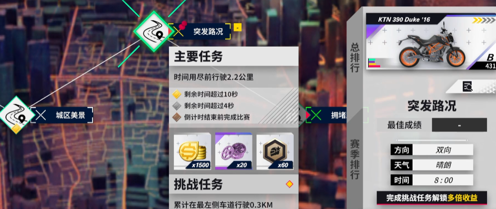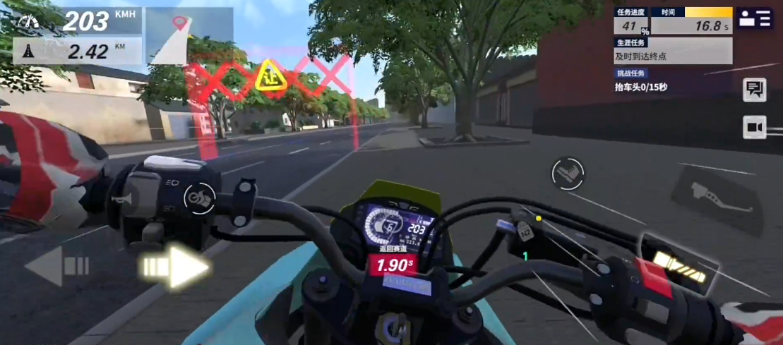 这一关的地图可以从弯道那里分成两部分,前半段要又快又稳,而且一路上有好几个减速带,通过翘头可以规避掉降速的影响,当然直接过也行,虽然车子的速度会降低一点,但操作空间更大了,且更不容易摔车。其余的就是常规的超车、蹭时间、躲避减速。