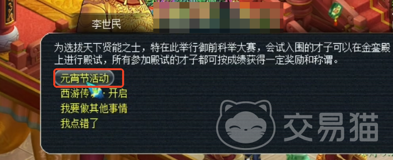前往金銮殿找到李世民对话,会有元宵节活动的选项。每个号都可以过来领一下,有几率给到金刚定魂兽爵5宝、黑宝石1颗。这里李世民让玩家用七十二变完成他的一个心愿,可以变成“魏征”的样子,注意这里是用“形变”,完成后可以得到7点元宵积分,以及一个“心愿达人”的成就。