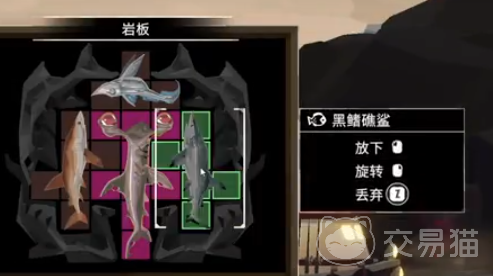 特拉尔湾的岩板就在右下角的小岛上,大家抵达后可以看到一块巨大的岩石屹立在海面之上,上面刻有4条强壮大鱼的图形,有4条大裂缝贯穿了它的底部,这个谜题非常简单,只要放入1只黑鳍礁鲨、1只短尾真鲨、1只锤头鲨和1只魔鬼鲨。