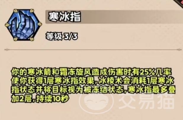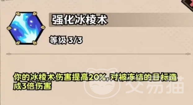 而强化冰棱术则是提升冰系法术伤害的关键天赋,一旦将其点起来,冰棱术的威力将会得到质的飞跃,它能够强化你的冰棱术伤害,使其提高20%,不仅如此对于被冻结的目标,强化后的冰棱术更是能够造成3倍的高额伤害,寒冰指是当大家的寒冰箭和霜冻旋风造成伤害时,会有25%的几率使大家获得一层塞冰指效果,这个几率虽然并非每次都能触发,但在持续的攻击过程中,积少成多,也能为玩家积累起可观的寒冰指层数。