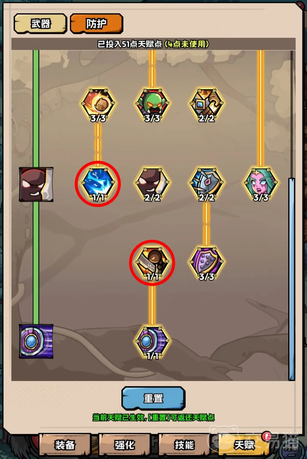 天赋的选择也很重要,防护天赋比较推荐平民选择,属性不算太高,可利用这个天赋降低CD以及流血效果,提高挂机的效率;天赋加点方面优先和群怪效率相关的就好,比方说增加雷霆冲击伤害,减少冷却时间。