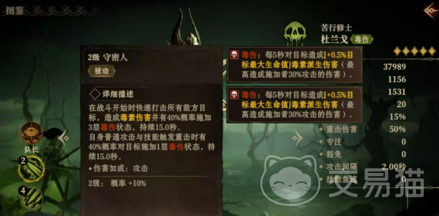 杜兰戈的被动技能可以说是他的一个杀手锏,让开局变得非常有利。作为游戏中为数不多的能让角色开场就直接出手的技能,杜兰戈的被动不仅能让他抢先对敌方全体进行一次攻击,还能给敌人施加一个毒伤状态。这意味着毒系队伍可以在开局阶段就开始铺垫毒伤,为后续的爆发打好基础,简直是一举两得。