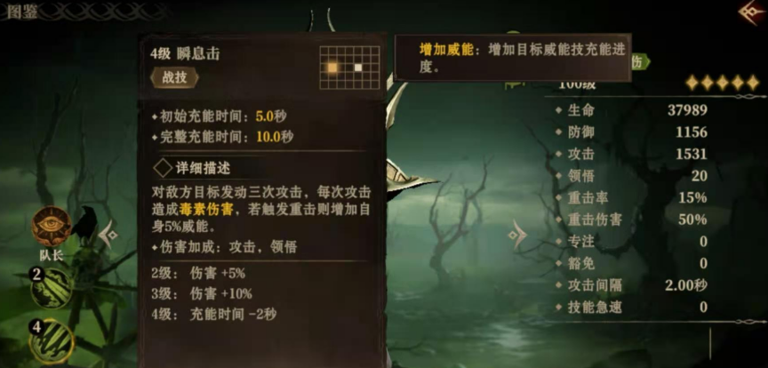 虽然杜兰戈的战技看起来似乎有些简单——单体攻击、伤害提升,听起来也许不够吸引人,但实际上,这项技能却在高攻击加持下爆发出极强的伤害,特别是在击中敌人的关键时刻。更为重要的是,杜兰戈的战技有一个极为有趣的机制:每次攻击如果触发重击效果,都会为杜兰戈提供5%的威能提升。理想情况下,三次战技就能让威能增加高达15%,这让杜兰戈的输出能力进一步增强。而且,随着威能提升,杜兰戈的毒伤会更加致命,对敌人造成的压制效果也会更强。