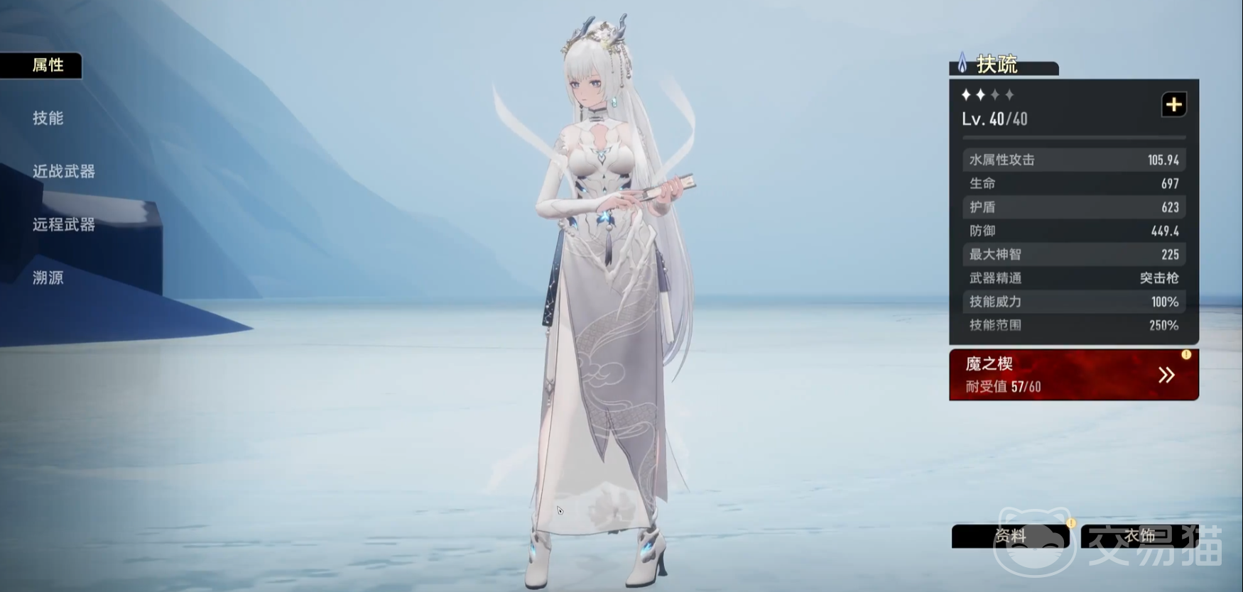 她是一名水属性的角色,攻击力109.54,虽然攻击力并不是十分的强悍,但是她的定位并非输出,而是辅助型的角色,专攻的方向是治疗。召唤技为“提掣浮沉”,施放之后,可召唤出“云璃”,这个物件最多同时有2个存在。
