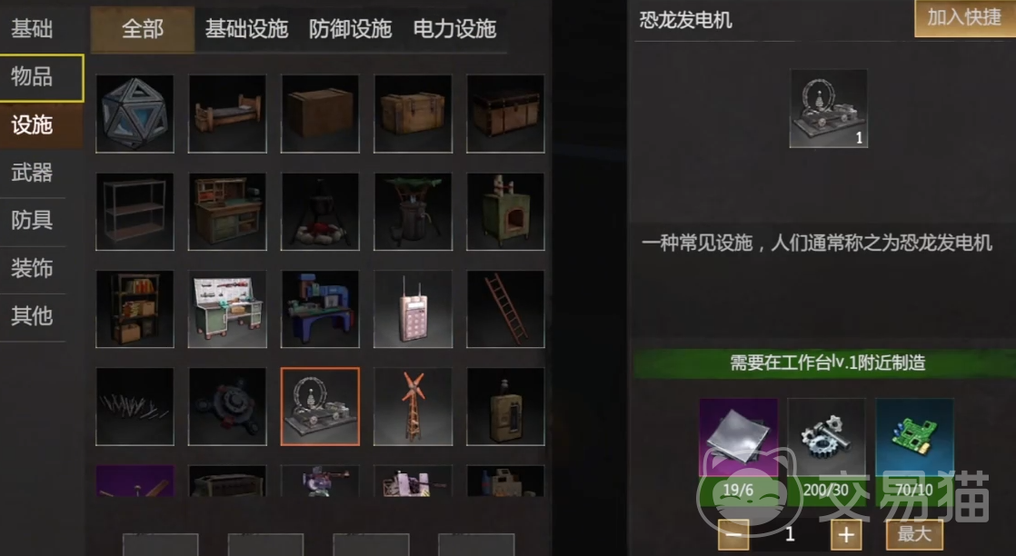 大家先打开制作台,进入到其他中制作一个乘骑装置,这是我们驯服恐龙的必需品,然后再制作一个恐龙猎捕装置,全部制作好后我们到野外区域找到恐龙,注意一定要找副栉龙,只有它才可以发电,找到后在它的旁边放置恐龙猎捕装置。