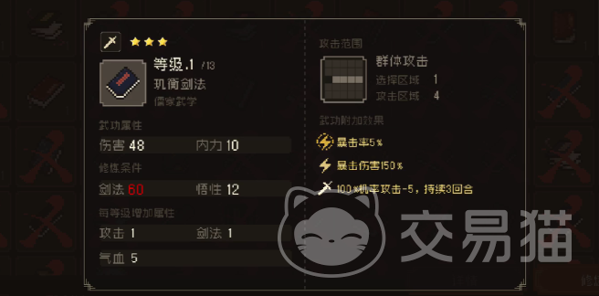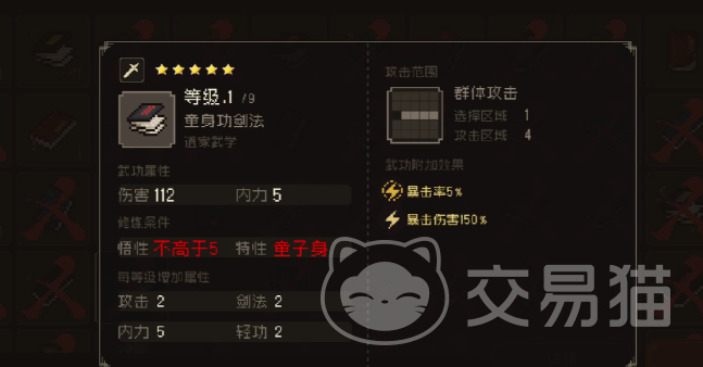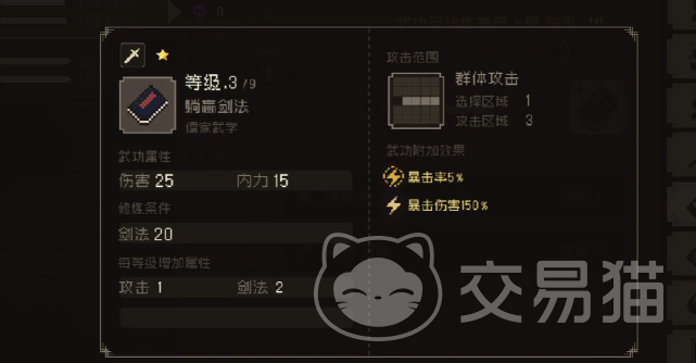 这一个剑法的基础伤害是20点,内力加成是15点,暴击率可以达到5%,暴击伤害达到15%,攻击的范围是直线三格。获取的方法也很简单,玩家在出生之后就会出现在羊太傅庙的剧情中,在这一个剧情中,玩家只需要2选1即可,如果选择剑法,马上就能够得到这一套剑法。可以把剑法提升到9级,每提升一级都可以获得两个剑法造诣,还有一点攻击力满级伤害为55,因此在前期,这一套剑法确实不应该忽视。