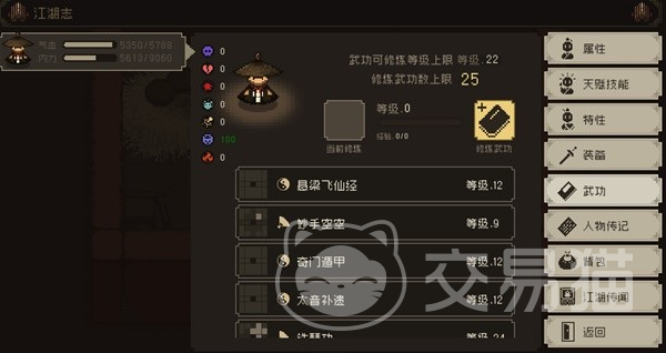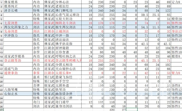 在武学功法的搭配上,玩家可以选择26种不同的功法,童子剑以及踩脚不需要考虑直接删除就行了,这些功法在根骨天赋点到了25点后都能学习。