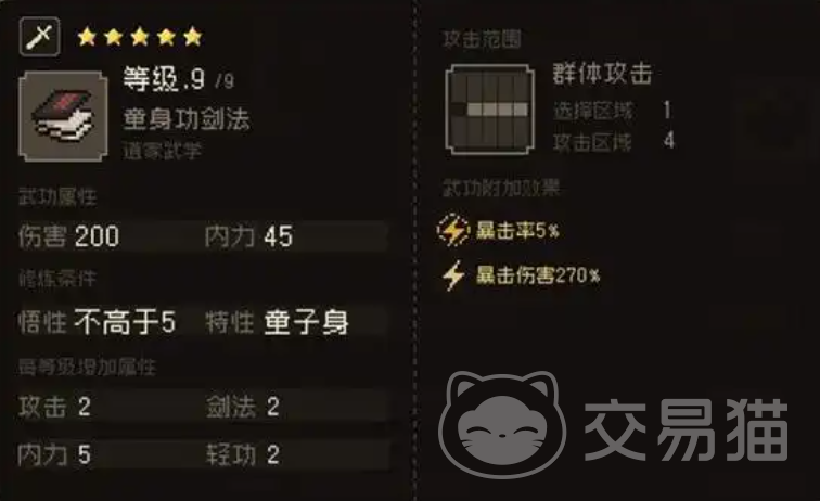 我们在游戏中想要获得童子身特性的话,方法非常的简单,只要学习指定的武学组合就行看,比如说我们把童子身和浑型无穷天象给i组合哎一起就可以获得关于童子身的特性之一无忌白首太玄。