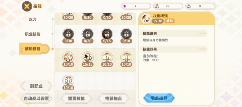 除了主动技能外职业技能的选择也同样重要,对于双刀职业而言,优先选择等价交换、夯实基础、攻击精通、暴击暴伤精通、天赋异禀、狂神之力和狂战士基础等技能,能够全面提升角色的战斗能力,特别是等价交换技能,它能够让玩家在战斗中灵活切换属性,以应对不同类型的敌人和战斗场景,在被动技能方面,老七样即大小攻击、背击、暴击暴伤、力量增强、幸运增强等依然是优先选择的对象。