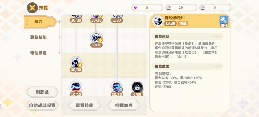 因此建议将凌波斩放置在更易于操作的位置上,以便在关键时刻迅速释放,而当技能书资源充足时,大风车的收益则相对较高,此时可以根据个人习惯和战斗需求,将大风车放置在更便于连招的位置上,神经暴走的效果能够持续时间长达半小时之久,在提升角色的攻击速度和暴击率之后,建议玩家在战斗前手动开启这一技能。
