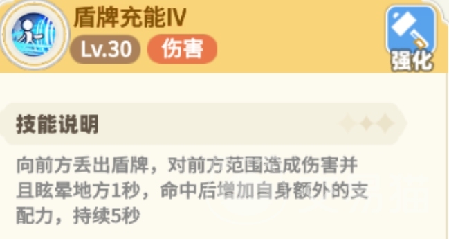 在前期书不够的情况下,锤盾主要输出技能是圆月斩,加点的时候直接拉满15-10-3,命中三层能打出1000%的攻击力伤害,配合盾牌充能技能触发支配的时候伤害非常之高,强化后总伤害增加420%,学习后还能增加自身追加伤害,后期会给自身以及队友增加35%支配力以及一次免控效果,持续10秒,冷却时间30秒。