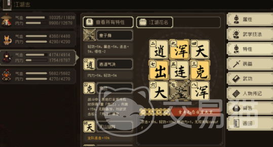 第三个的话,玩家可以选择出手式、白猿惭剑、玲珑指和好主人,在一起使用的话,不仅能够解锁神招乍现白猿惭剑,而且对于一些执法修炼的玩家来说,使用玲珑指可以直接将质粒提升10点,在队友当中如果有大黄的话,通过好主人则可以提升大黄50%的几率助攻。如果你是剑法爱好者,还可以使用一通百通以及狂风浪潮,这两大特性的加持让你可以直提升剑伤伤害和攻击率以及暴击率,对于学习特殊武学者还可以提升20%的伤害,整体加持还是非常可观的。