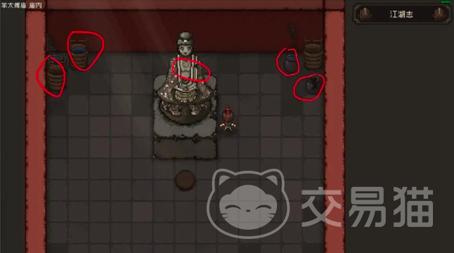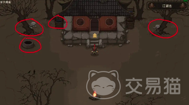 在前期玩家第一个解锁的地方是羊太傅庙,抵达该位点后会在左右两边的枯树下发现一些银子,小编在下图当中也圈出来了,之后要到庙左侧的废弃水桶旁边进行翻找,能够在其中发现一个包子可以为玩家进行体力补充之后跳下枯井,就会捡到一把武器,不过需要提醒大家的是,跳下枯井的话一定要做到轻工大于31点之后打开背包就可以进入到庙宇当中了。