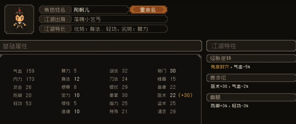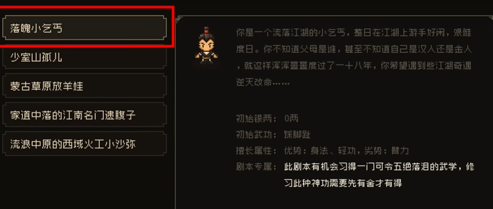 出身的选择上有孤儿、乞丐和放羊娃,孤儿的综合性强,几乎能学所有功法,还有概率获神功,在悟性低于等于4时能解锁特殊任务线,建议搭配高定力与高道德,可增强战斗续航,获取隐藏奖励,乞丐可直接进入丐帮学打狗棍法,悟性高还能入佛门学十八铜人阵,如果想走丐帮流派或佛门高悟性流派,是不错的选择,狮吼功是前期孤儿流派中AOE能力最强的功法,放羊娃臂力数值较高,若前期获取“蒙古战神”词条,可进入次列都作为开局城市,走江湖路线,适合培养臂力,学习如降龙十八掌等特殊流派。