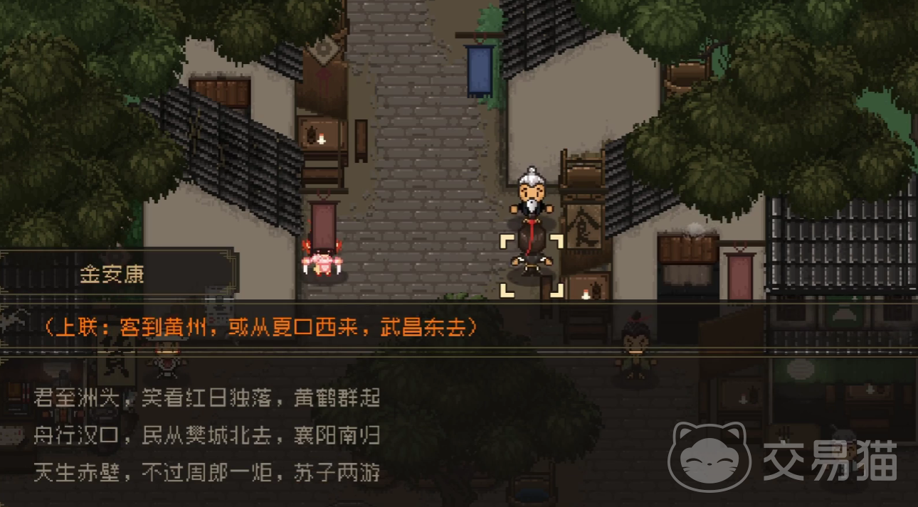 算命先生的字谜全部猜中后前往楚乡城,找到金安康,在和金安康开始对话之前,玩家可以先去金安康左边位置的商人这里开启第一段对话,和商人结束对话后,点击金安康,济南康会给你出上联,然后在给你三个下联的选择 你要选择出正确的下联,下联的选择选第一个君至洲头,笑看红日独落,黄鹤群起,就行了,对联猜对的奖励也是比较不错的属性加成。