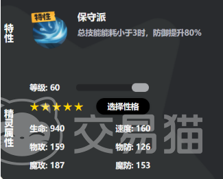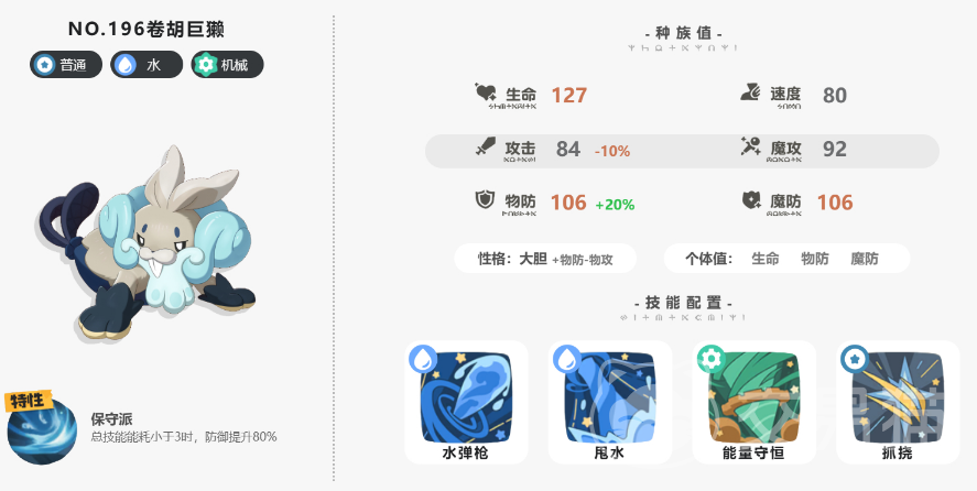 它的特性是“保守派”,这意味着当它使用能量消耗小于3的技能时,它的防御会提升80%。这不仅能让它在低消耗技能的情况下更好地承受伤害,还能提升它的生存能力,使它成为玩家队伍中的“铁壁”。