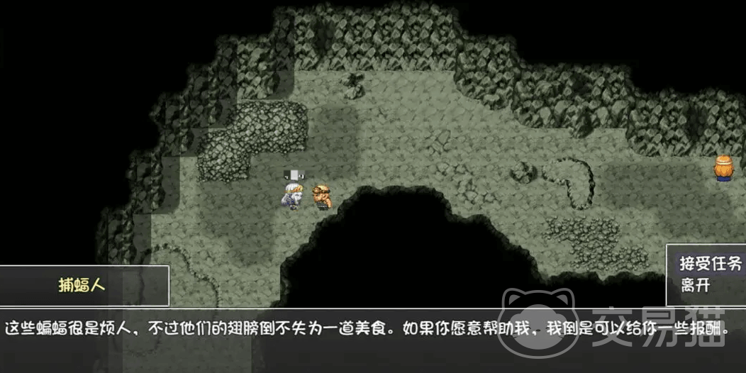 先前往洞穴,在其中找到下图中的NPC捕蝠人,和他对话后接取任务,任务非常简单,只要击杀蝙蝠拿到7个蝙蝠翅膀就可以提交了。