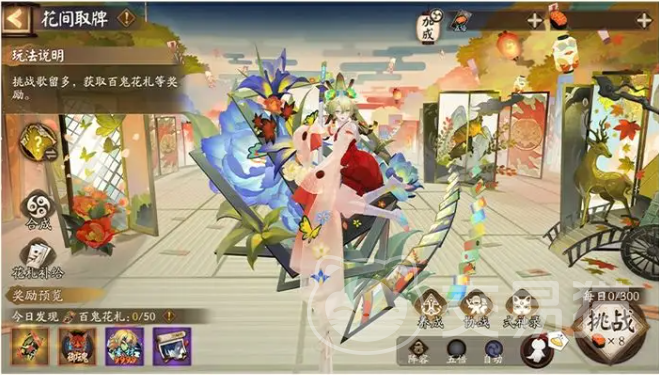 1、“花间取牌”玩法。消耗一定体力参与,挑战歌留多,有概率掉落1-6星的“百鬼花扎”,获得高星的概率随着大家获得百鬼花札数量的增多而提升,在这能自选御魂或者觉醒材料。