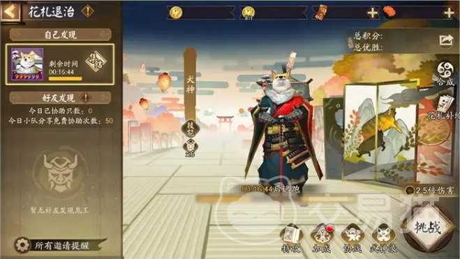 2、“花札退治”,可使用1-6星的百鬼花札召唤对应星级的随机花札鬼王进行挑战,在限定时间内战胜鬼王后获得“文点币”,可用于在未来小铺中兑换奖励,可邀请好友或者是寮友进行助战,协助好友或寮友击败鬼王也能获得奖励,在该战斗中,可借助式神协助作战,每日次数上限和活动开始时大家拥有的六星式神数量有关。