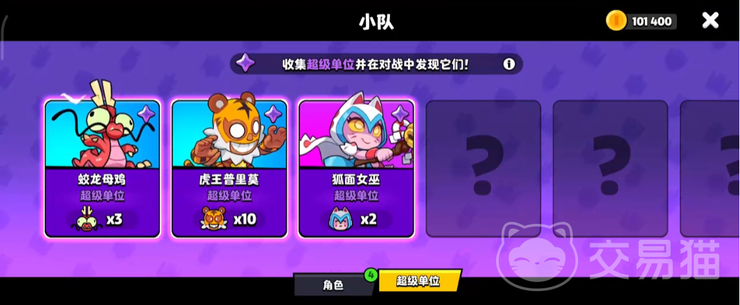 超级单位是游戏中特殊的角色,目前公开的超级单位有4个,数量可谓是比较稀有了,那么大家都知道游戏开局时只拥有一个角色,而剩下的其他角色都是要去战斗获取宝箱来开出来的,超级单位也是这样。