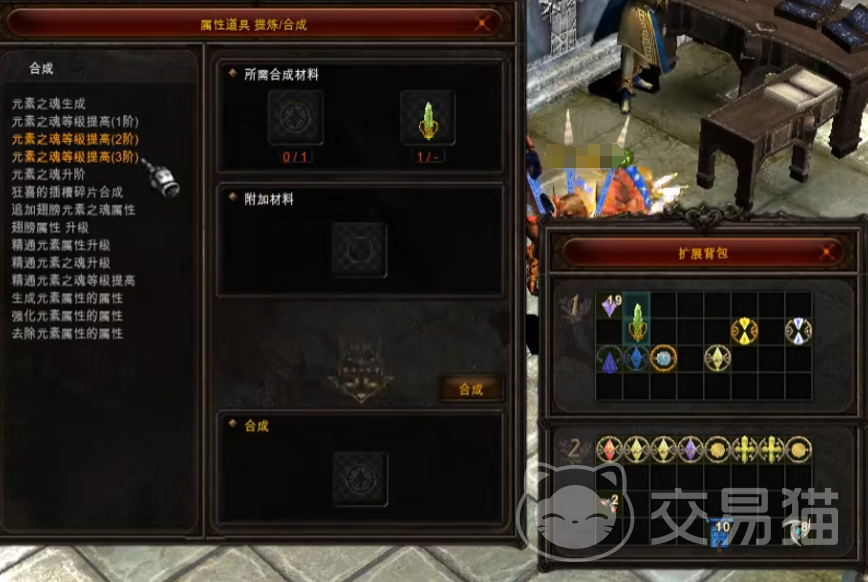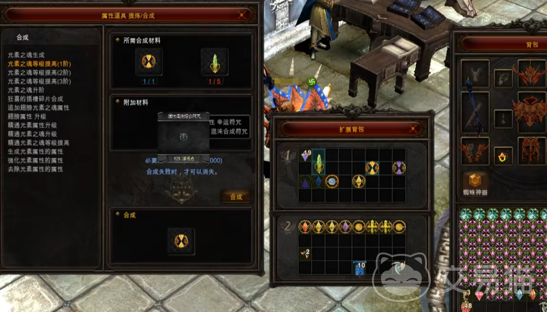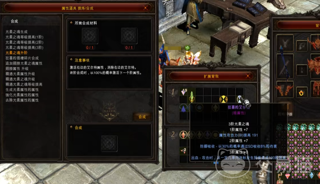 接着在自己的背包里面找到两个狂喜,接着我们要将他们强化至+7。然后再点击第二个对话选项,也就是元素之魂等级的提高。除了需要放入一个狂喜之外,然后还要加5个强化道具。如果你担心强化失败的话,就可以放入一些保护符咒。