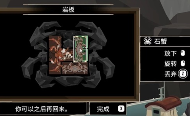 第三个石碑在盖尔悬崖,在这里玩家要把一只装饰蟹和两只石蟹放到空位,可以先竖向放置装饰蟹,然后剩余的两个空位正好横竖放置两只石蟹,放置完成之后就能得到深渊巨口,这是一个外观造型非常像鲨鱼的笼子,任何鱼类都能轻松捕捉。