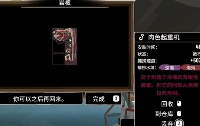 最后一个石碑在斯特拉尔湾,在这里要把魔鬼鲨、锤头鲨,短尾真鲨和黑鳍礁鲨放到空位里,短尾真鲨体型最小,可以放到最上面,然后下方依次放置魔鬼鲨,锤头鲨和黑鳍礁鲨,放置完成之后就可以获得肉色起重机,可以借助这个起重机快速捕获深海的鱼类,海沟里的鱼类也能借助起重机轻松捕获。