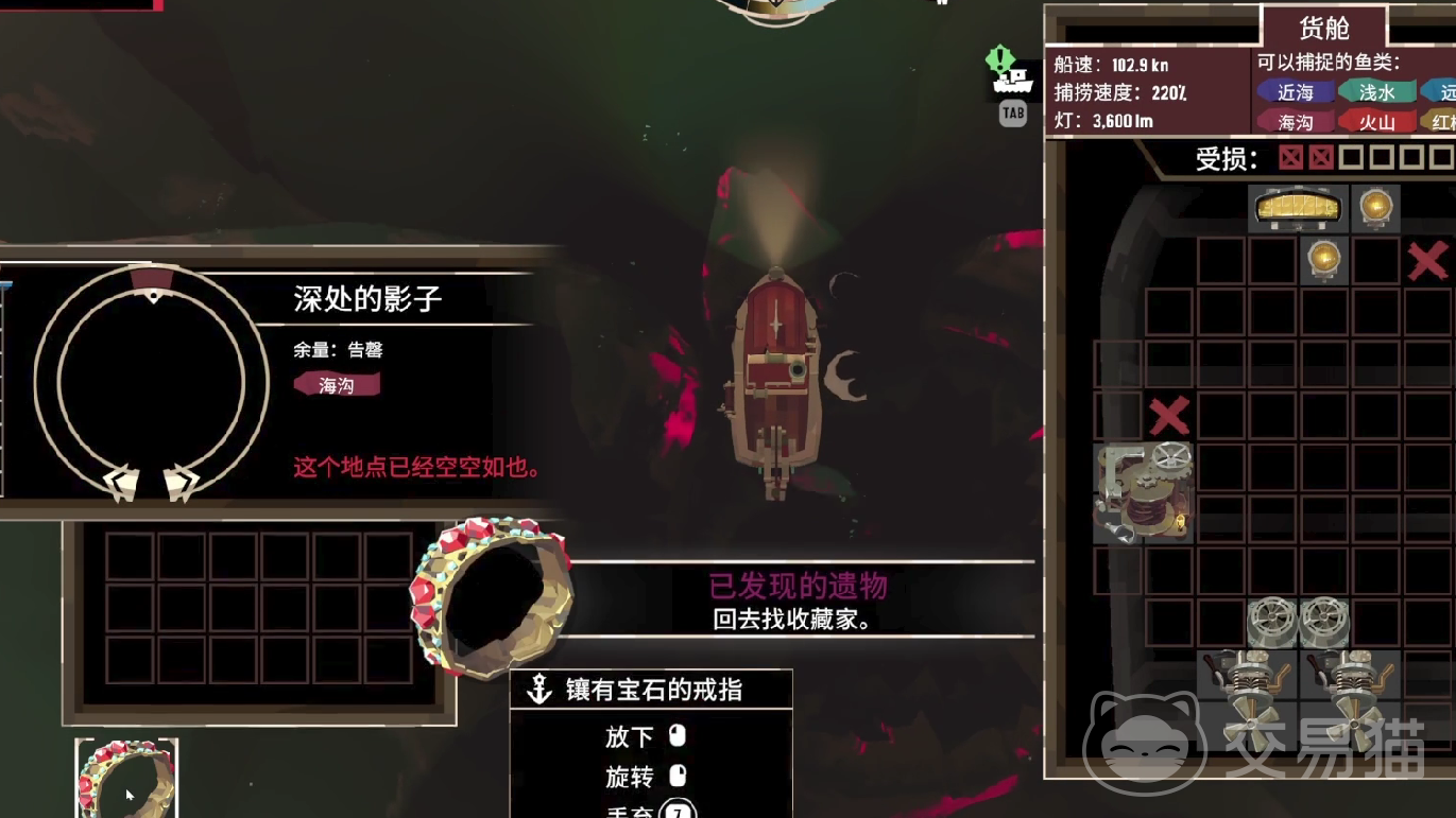 随后玩家直接驾驶船只,抵达海洋的中心区域,就能开启海沟装备,把阻拦航路的海葵吓退,在这之后,玩家重新前往到海葵生物的栖息地,即可在海葵的中央,在深处的影子之中,拿到被诅咒的戒指,这枚戒指就是斯特拉尔湾的戒指了,该戒指是重要的献祭道具,玩家在完成了所有任务后,需要重新找到研究人员,将戒指交付给他。