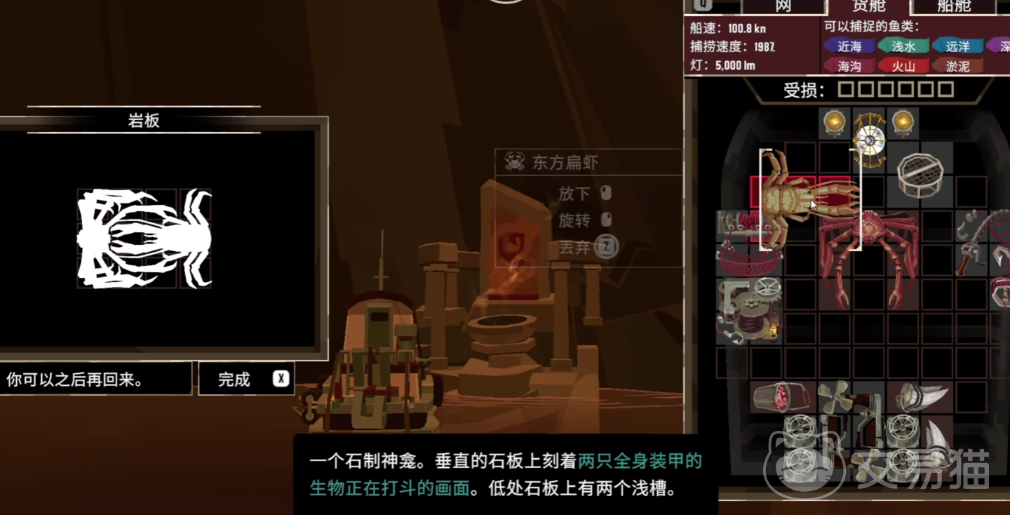 打捞任务的解谜环节比较简单,玩家只需要将背包当中的指定鱼类放出,并且保证献祭物品足量,这样就可以进行通关了,在获取了所有石碑碎片后,玩家可以拼凑成一个石碑,石碑上讲述的是玩家主线剧情内容当中的重要外神信息,玩家在获取了石碑信息后,就能够了解到献祭外神的仪式细节~