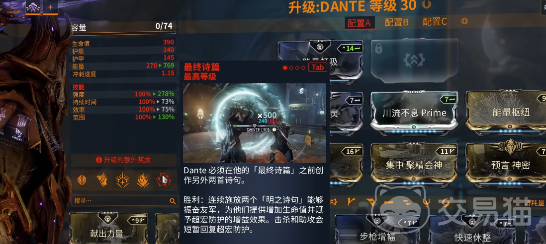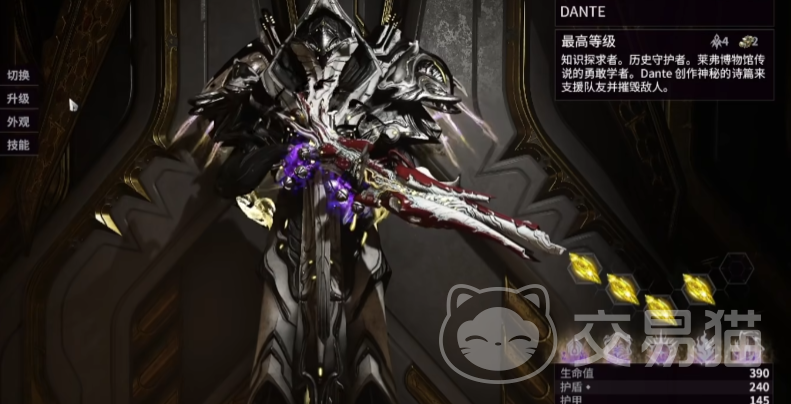 被动技能“编年史之印”,但丁的显赫类武器“夜枭”可以扫描目标,记录信息以供使用。对已完全扫描的目标,状态几率增加。技能“明之诗句”,但丁的振奋旋律为自己和盟友提供境界,并且能增加生命值。