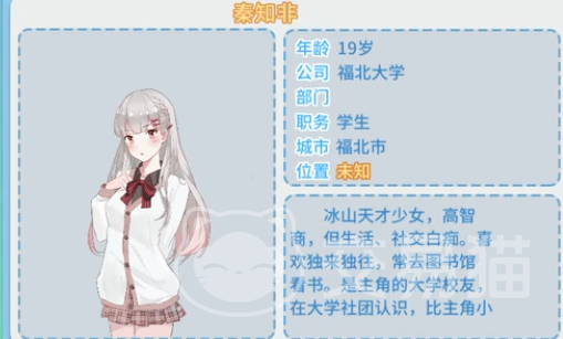 秦知非是一个还在上学的学霸,高智商但是生活和社交上比较白痴,喜欢独来独往,在剧情中我们是她曾经在学校内的学长,在社团内认识,她的第一次出现就是准备来玩家所处区域参与数学竞赛,并询问我们有没有什么比较推荐的旅游景点。