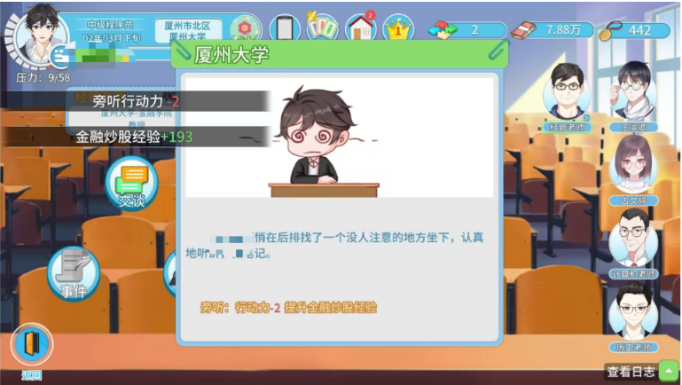 玩家可以通过返回出租屋选择“思维”选项来完成一些小任务,这些任务会消耗一定的行动力,并以此增加你的思维值。在早期游戏阶段,将部分资源投入到提升思维值上,为后期进入股市和应对高风险投资打下坚实基础。此外,在游戏早期,我们可以在厦门大学旁听或者在厦门图书馆阅读,来提升金融炒股经验。
