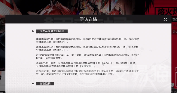 这一次的卡池其实就是一个和up卡池比较类似的相似。想要获得6星干员基础的几率大概是在0.8%左右。如果经过65抽之后还是没有获得6星角色,后续每抽取一次就能够增加5%的几率,最多80抽一定可以获得6星角色。