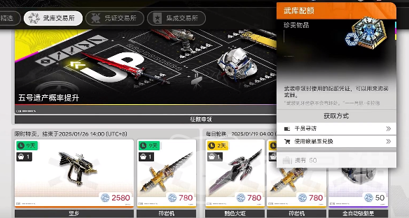 接着可以看一下武器的抽取,在游戏里面还会有武器池,不过抽取武器的资源和传统的模式是完全不一样的。抽取武器所需要的配额是根据抽取限定干员来获取。每次在抽到6星干员之后就可以获得1500,五星干员可以获得500。在正常的情况下抽取20~30必然就可以获得10连抽。