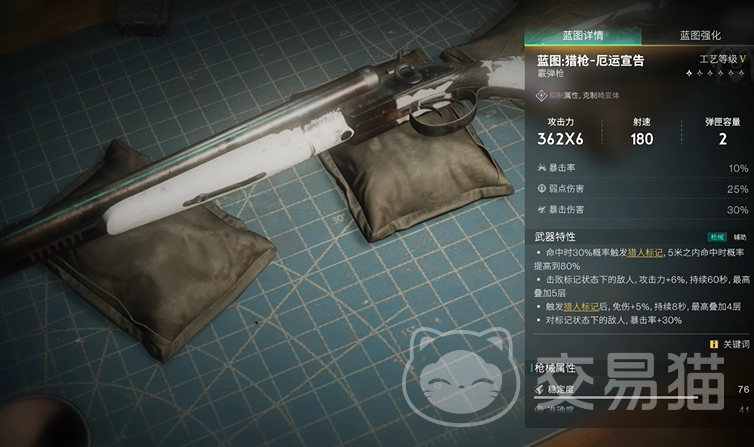 大白鲨手枪犹如隐匿在暗处的致命猎手,其独特的爆弹生成机制令人胆寒,一旦触发不仅能显著提升暴击率,更能让伤害数值如火箭般蹿升。当它升至满级,攻击、暴击率与伤害完美融合,展现出恐怖的近战杀伤力,在近距离遭遇战中,往往能瞬间扭转战局,让敌人来不及反应便已倒下,厄运宣告霰弹枪在狩猎场上威名远扬,专为猎杀被标记的猎物而生,当敌人被附上狩猎标记,厄运宣告便会如同被唤醒的猛兽,攻击伤害瞬间得到大幅度提升,在狭小的近距离空间内,它的每一次射击都如同雷霆万钧,密集的弹丸能将敌人的生命值瞬间清空,让对手毫无招架之力。