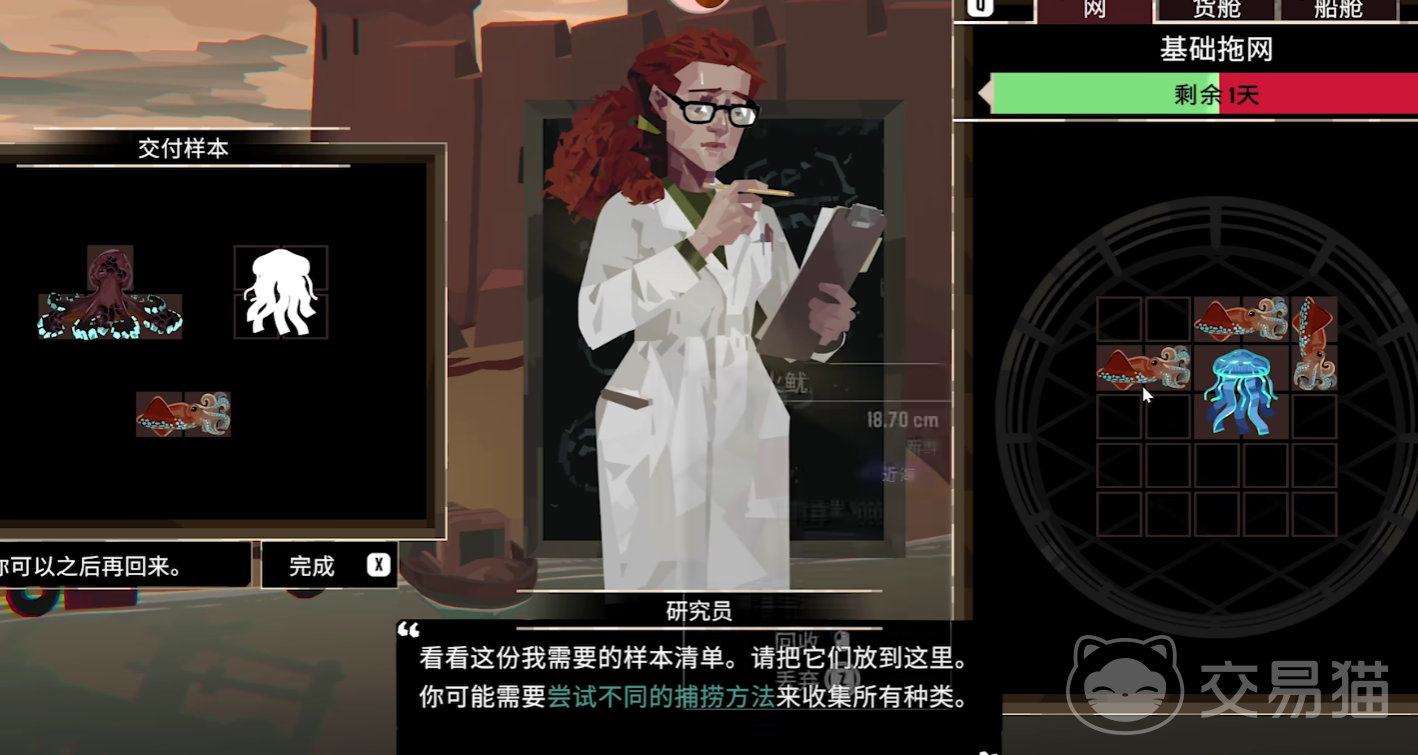 样本全部收集完成后,玩家折返寻找到研究员,即可将样本兑换成圆形零件,圆形零件是用于制作深海钓钩的重要道具,玩家在取得零件后,折返进入到铁匠铺,就能给自己打造一份深海钓竿了。