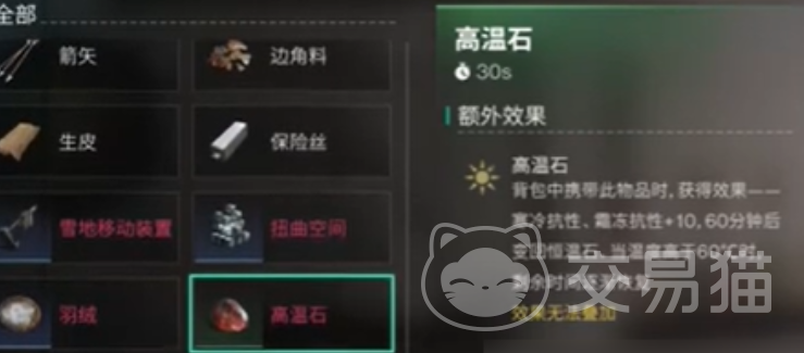 在游戏中有一种名字为高温石的物品,这种物品是可卡因直接提高角色寒冷抗性的物品,这种物品可以通过合成获得,玩家在模因中先使用炭火制成恒温石,然后在把炭和恒温石合成在一起就得到了高温石,这种石头可以直接增加10点的寒冷抗性,可维持60分钟。
