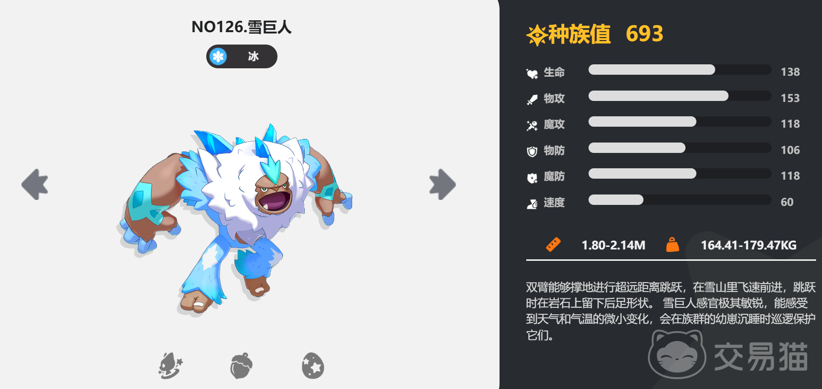 雪巨人的外观顾名思义是个浑身长有白毛与冰凌状尖刺的巨人,性格沉默沉着冷静,别看外观看起来傻傻憨憨但是感官却非常敏锐,能够听到非常远范围的各种细微声音,而且动作很敏捷善于攀爬。同时具有很强的责任心,雪巨人的生态方式是群居模式,因此玩家在捕捉的时候也经常碰到在洞穴群居的雪巨人团体,在幼崽休息的时候成年的雪巨人就会展开巡逻,因此想要捕捉幼崽并不容易,经常会发生车轮团体战,捕捉难度较高,最好找那种落单或者出去觅食的雪巨人会更容易成功,而且最好不要在温度过于寒冷和山丘地带,这些情况对于雪巨人的能力也会有加成。