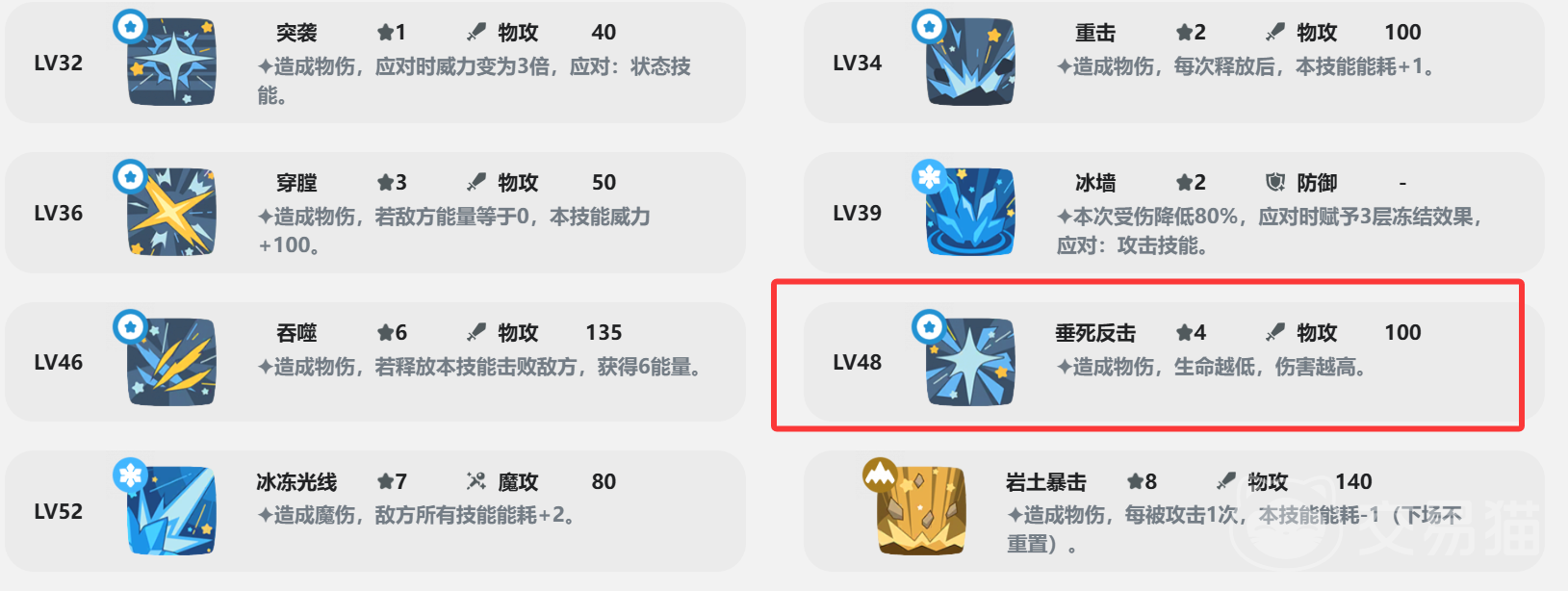 中期技能作用开始施加冰冻效果,拥有暴风雪、碎冰击、偷袭,开始施加冰冻效果,尤其是暴风雪和碎冰击的叠加技能能够先冰冻限制对方,然后碎冰造成额外伤害,并让对手的技能消耗全体增加1点。后期可以用穿膛+垂死反击+吞噬+冰冻光线来打出超高的输出以及让对手的技能消耗大幅增加,导致其能量非常短缺的情况,终极技能岩土暴击可以多次触发,在释放之前每被攻击一次技能消耗降低1点。