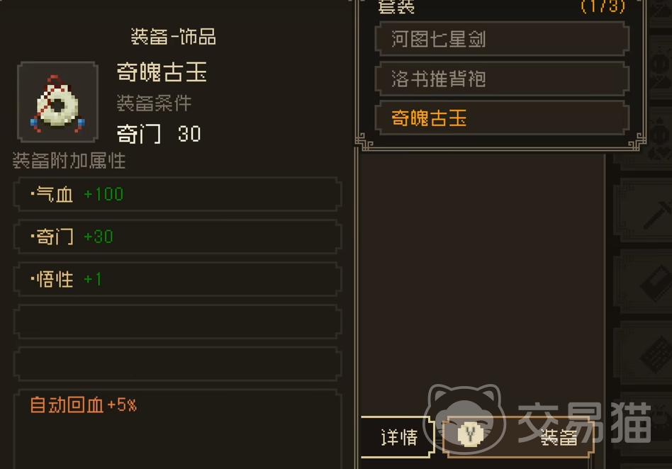 这个小李子的宝藏里面有一个非常不错的饰品,奇魄古玉。这个古玉在前期的装备之中非常不错。它可以增加100点的气血,30点奇门以及1点悟性。它的技能是100%的几率会自动回血+5%。但是装备需要奇门30点才可以装备。