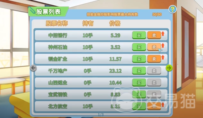有了一定属性后,点击下方的股市,就能看到各个不同的股票,他们有着不同的价格,初期由于资金有限的关系,尽量不要一次性购买那么多,可以先进行试探性投资,每日观察好每支股票的价格走势和市场动态。