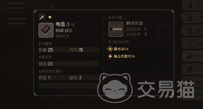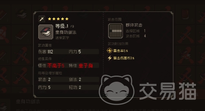 若玩家有志于走剑法流派,那么保证自身具备童子身这一特性就很重要,而且悟性不能高于五点,在满足这些条件的情况下,玩家可以学习童子功剑法,这乃是游戏中基础伤害倍率最为可观的一种剑法,它能够帮助玩家获取高达112点的基础伤害数值,同时还能增加五点的内力,每当该剑法提升一级,分别可以为玩家提升两点攻击力、两点剑法数值、五点内力数值以及两点轻功数值,全方位地强化玩家的战斗能力与角色属性。