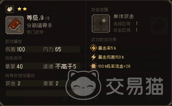 分筋错骨手,属于一门掌法,它作为少数拥有强大控制效果的掌法之一,当使用者在战斗中果断施展这门掌法时,敌人在掌法的作用下,瞬间便会失去行动的能力,这种控制效果并非分筋错骨手的全部威力所在,在实现强控敌人的同时,它还附带一段相当可观的伤害输出,在属性加成方面分筋错骨手同样表现出色,它可以给予使用者气血加成,