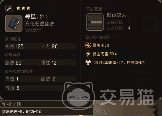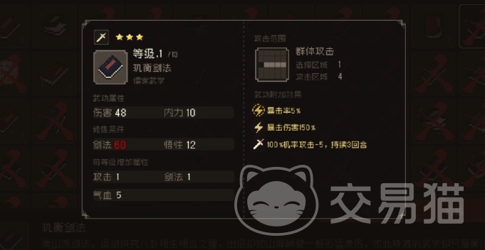 然后姬蘅剑法便是后期值得考虑的一种剑法,其基础伤害数值高达48点,并且能为玩家带来十点的内力加成,不过修炼姬蘅剑法也有一定的门槛,它要求玩家的剑法造诣达到六十点,同时还需具备12点的悟性,每成功升级一级,攻击力在有所提升的同时还有五点气血的增益,有群体输出的同时它还能进一步增强玩家5%的基础暴击率,并且使玩家的暴击伤害提升150%,甚至在战斗中有一定概率使敌方的攻击数值减少五点,从而在战斗中占据更为优势的地位。