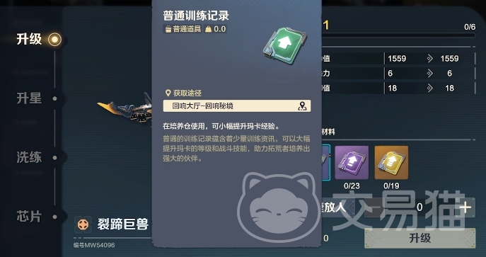 玛卡的养成方式有升级、升星、洗炼以及芯片这四种,大家可以在培养界面进行相应操作,玛卡升级需要用到训练记录道具,该道具分为普通、高级和特级三种,它们所提供的经验数量各不相同,另外玛卡参与战斗并获胜后也能获取经验。这里要注意一点,那就是玛卡的等级是不能超过角色本身的等级的,这三种训练记录都是很好获取的资源。
